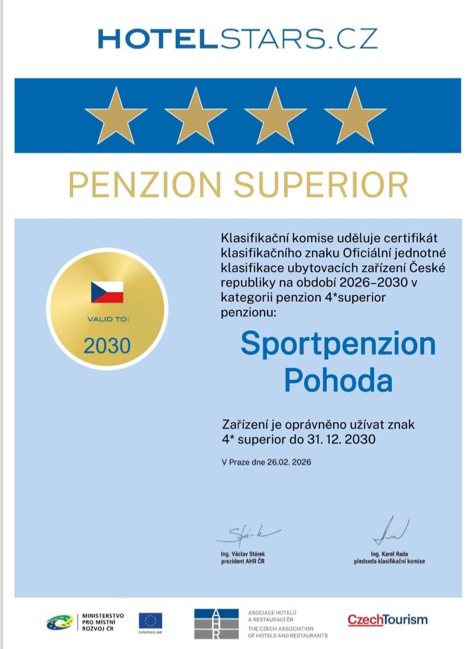 Máme velkou radost — náš Sporpenzion Pohoda získal oficiální 4★ certifikaci kvality.